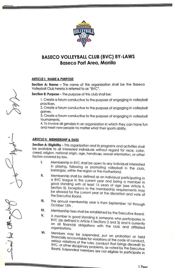 Section A: Name – The name of this organization shall be the Baseco Volleyball Club hereto is referred to as “BVC”.