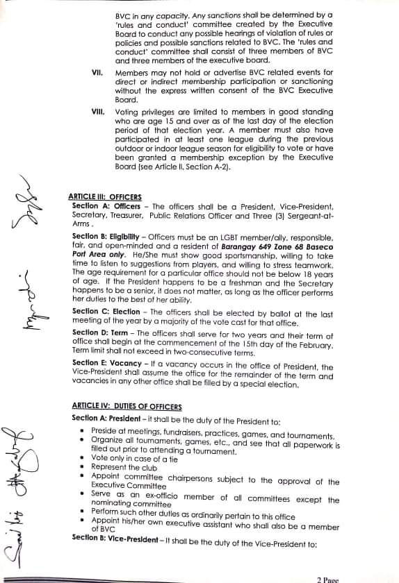 Section B: Eligibility – Officers must be an LGBT member/ally, responsible, fair, and open-minded and a resident of Barangay 649 Zone 68 Baseco Port Area only. He/She must show good sportsmanship, willing to take time to listen to suggestions from players, and willing to stress teamwork. The age requirement for a particular office should not be below 18 years of age. If the President happens to be a freshman and the Secretary happens to be a senior, it does not matter, as long as the officer performs her duties to the best of her ability.