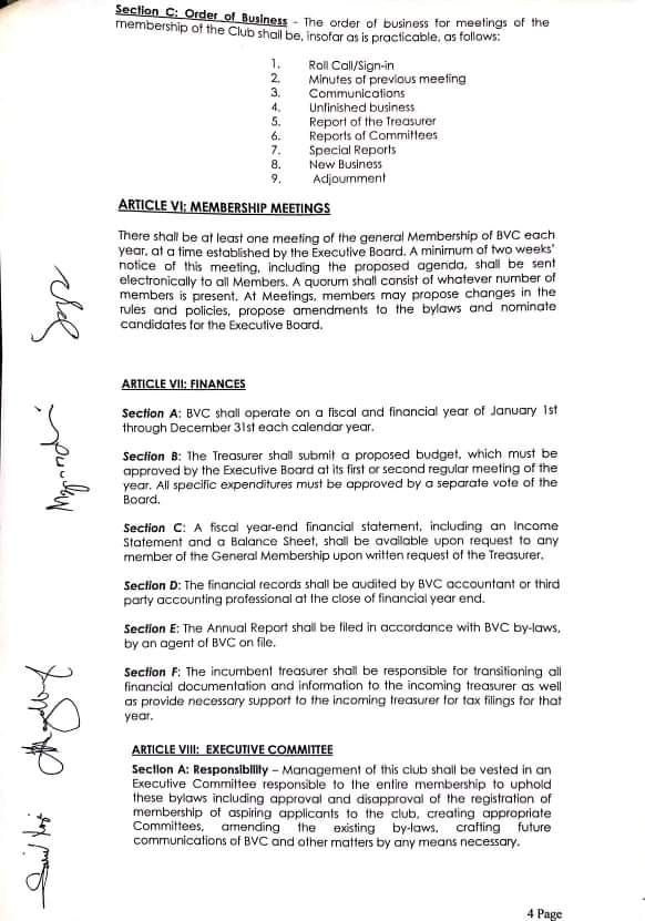 Section A: Responsibility – Management of this club shall be vested in an Executive Committee responsible to the entire membership to uphold these bylaws including approval and disapproval of the registration of membership of aspiring applicants to the club, creating appropriate Committees, amending the existing by laws, crafting future communications of BVC and other matters by any means necessary.